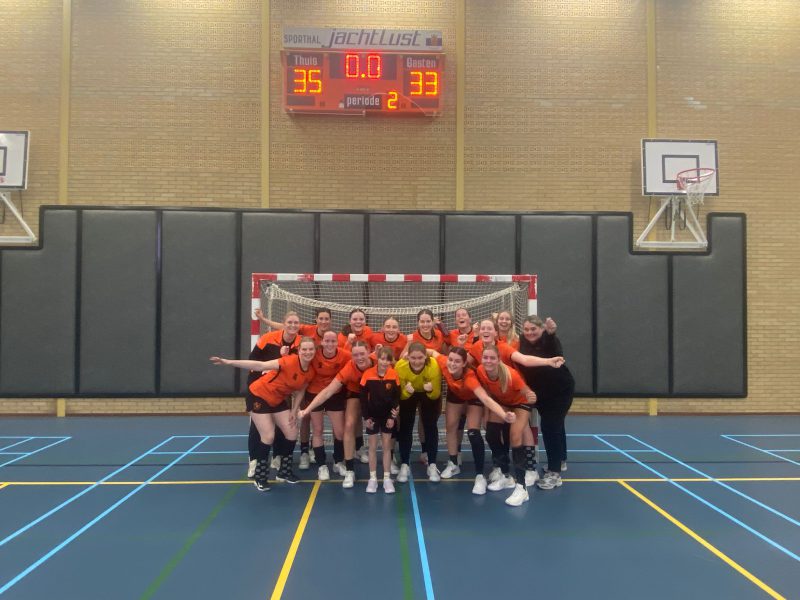 De tweede helft startte vervolgens net zo voortvarend als de eerste helft, al deden wij er nog een schepje bovenop. Nikki had twee rake schoten van afstand, Alineke op de break-out en ook Yara vanaf de linkopbouw was trefzeker. Daarna werd Bo nog eens mooi vrij gespeeld op de cirkel, die de 27-20 maakte. Het verschil was groot, maar de wedstrijd was nog niet gespeeld. HVBS kreeg ruimte voor meer break-outs en snelle tegenaanvallen, en hoewel een enkeling werd gekeerd door Brigitte kwamen zij langzaam dichterbij. Daarnaast verzilverden zij kort achter elkaar meerdere penalty’s. Wij scoorden in deze fase helaas niet meer. HVBS maakte een run van 32-25 naar 32-30, waardoor met nog een kleine 10 minuten de wedstrijd weer helemaal open lag. Door toch met elkaar te blijven spelen, maakte Nikki uiteindelijk een belangrijk punt vanaf de linker-opbouw. Na een penalty en een break-out van HVBS op 24-33 werd de slotfase ontzettend spannend, maar door de aanval vervolgens slim uit te spelen en zelfs nog een penalty eruit te slepen, wisten wij de wedstrijd met 35-33 naar ons toe te trekken.