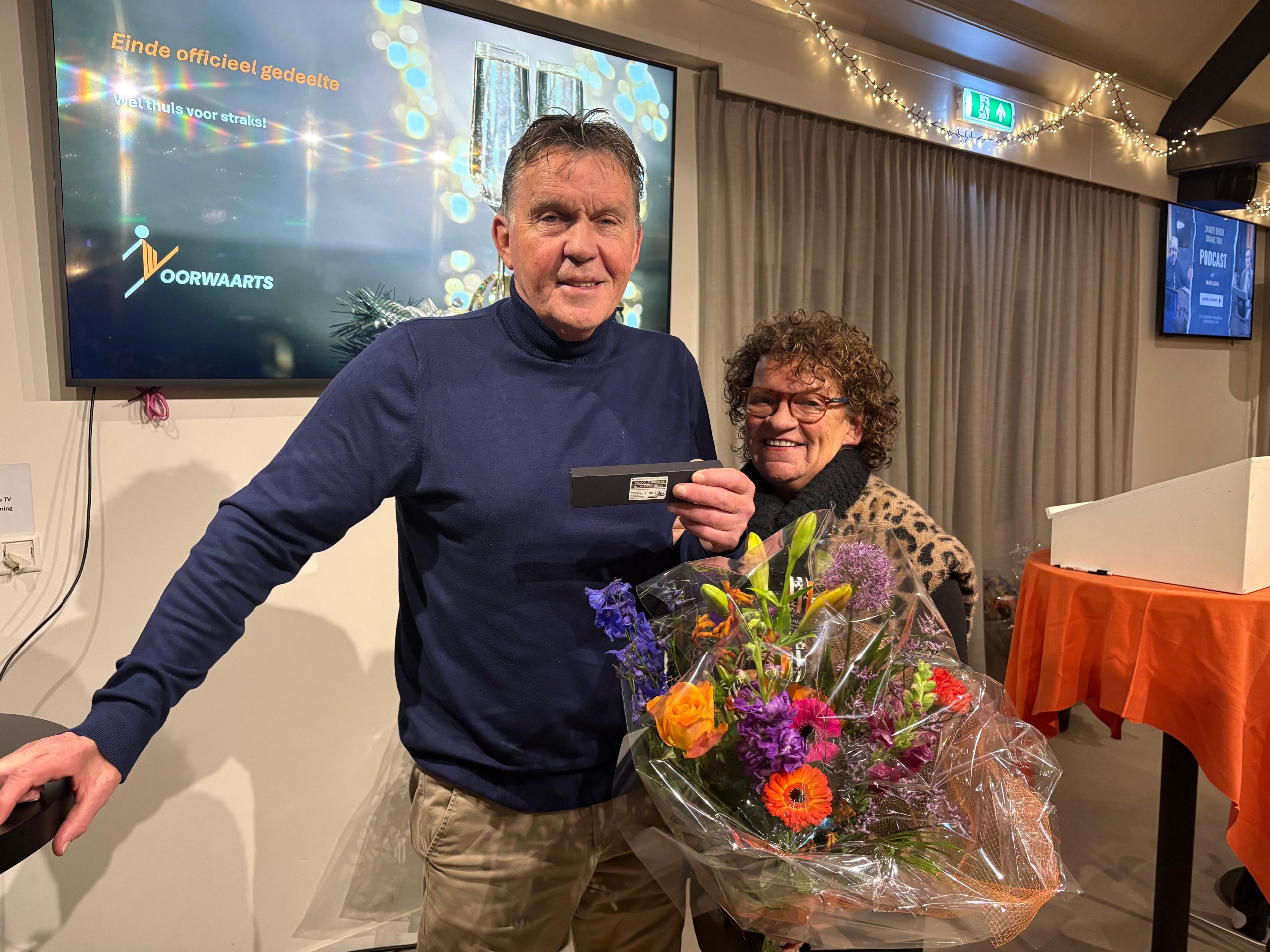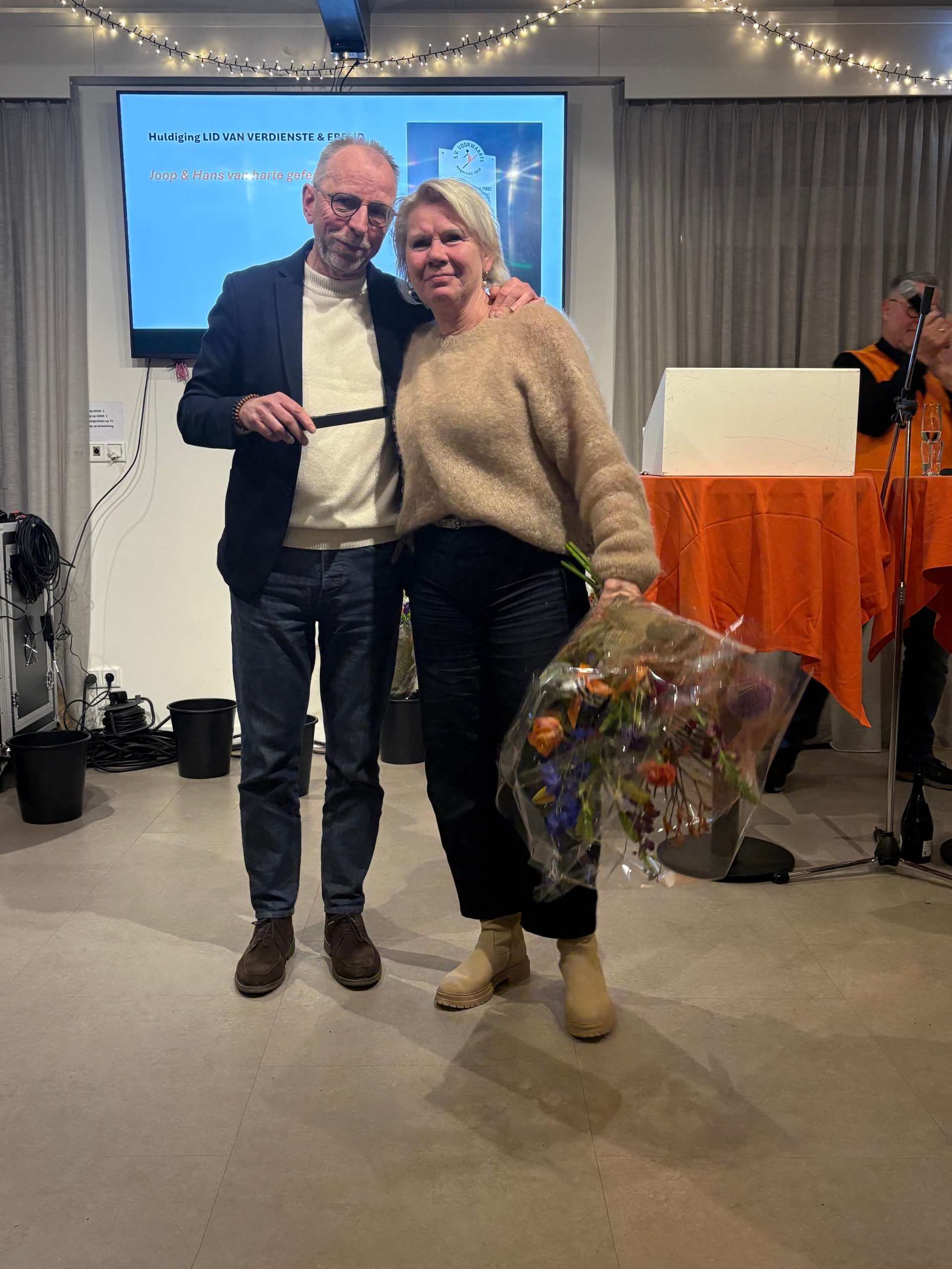 Tijdens de nieuwjaarsreceptie werd Joop op bijzondere wijze verrast met een fantastische videoboodschap van meerdere (oud-)handballers die hij training geeft of heeft gegeven. Ook Laurens en Liduine spraken hem toe vanuit een zonnig Bonaire, met wie hij een rijk handbalverleden deelt als speler en trainer. De boodschap was duidelijk: petje af voor iemand die zich al zo lang met zoveel plezier en toewijding inzet voor onze vereniging. Met trots mag Joop zich vanaf nu lid van verdienste van Voorwaarts Twello noemen.