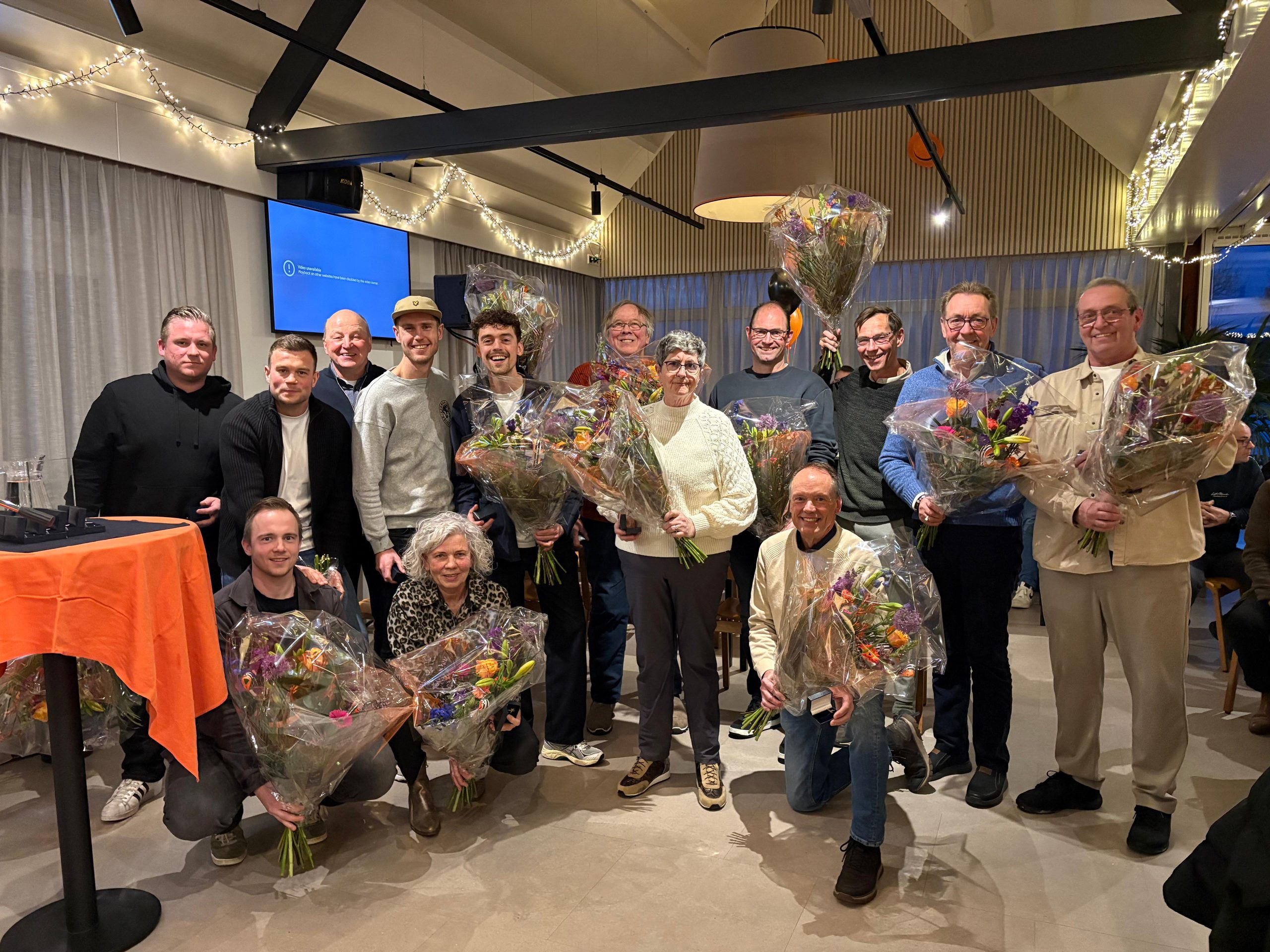 En dan nog een flink aantal 25 jarige jubilarissen met Marian Kamphuis-Jansen van de volleybal en de rest van de mensen op de foto vanuit de voetbal. Waaronder meerdere scheidsrechters en ook Nettie, een vaste kracht op de zaterdagochtend bij het wedstrijdsecretariaat. Voorwaarts 5 was goed vertegenwoordigd, zij hebben hun liefde voor de club wel op een hele bijzondere manier vastgelegd.