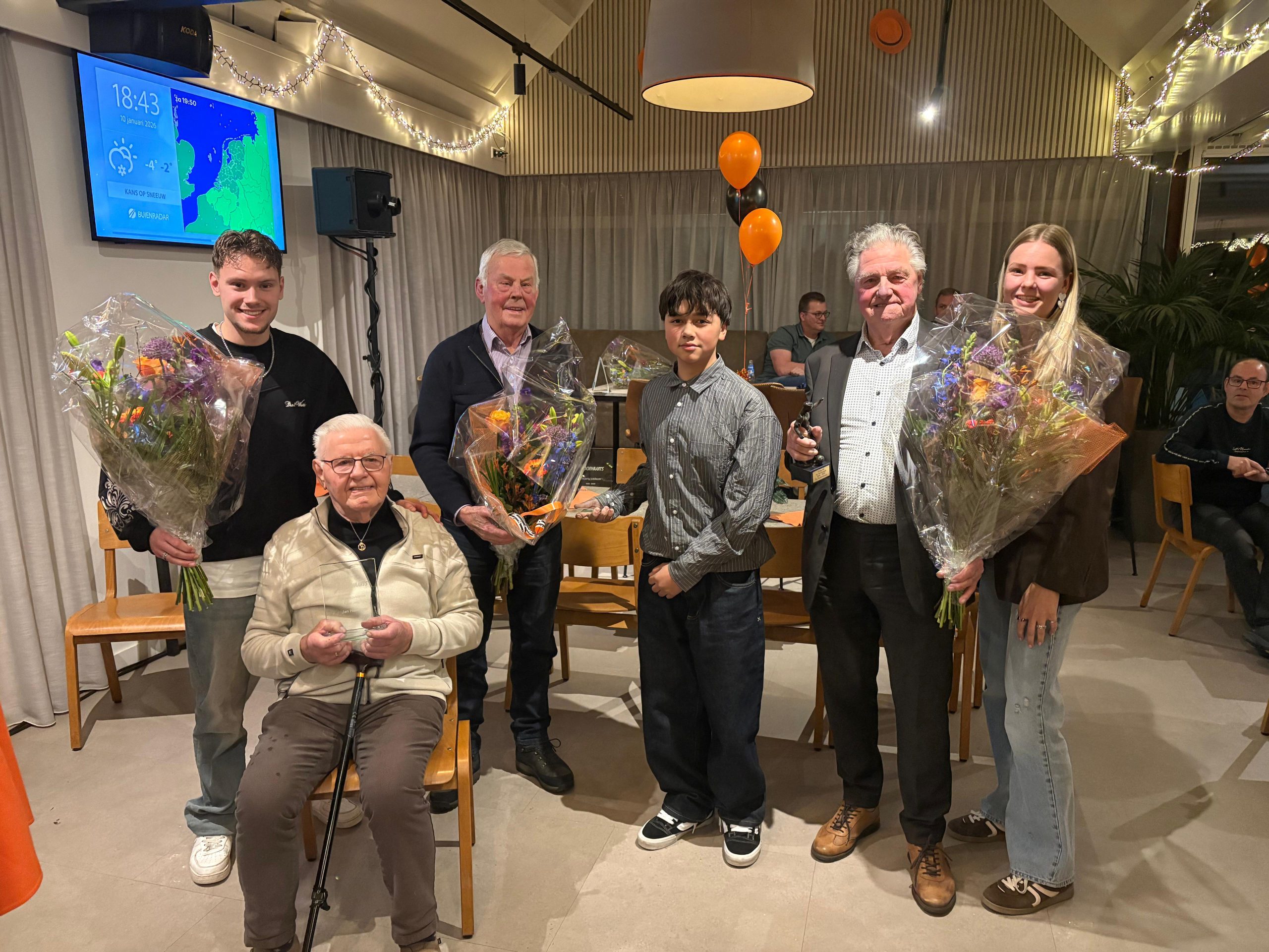 Daarna gingen we over tot het huldigen van de vele jubilarissen, dit jaar maar liefst 40. Je hebt leden en je hebt leden: de vereniging bestaat 91 jaar en Jan Bouwmeester is inmiddels 75 jaar lid. Jan Hafkamp en Rinus Hoogeslag al 70 jaar. Zij werden in het zonnetje gezet in het bijzijn van hun kleinkinderen resp. Lisa, Niels en Lorenzo. Zij sporten ook allemaal bij Voorwaarts. Zo zie je dat oranje zwart een rode draad is in vele families in Twello.
