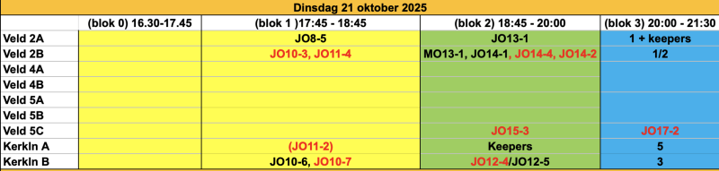 Deze week (herfstvakantie) geven we dagelijks een update van het trainingsschema. Hierbij is rekening gehouden met de beperkte belastbaarheid van de natuurvelden. In het rood zijn teams vermeld die niet gaan trainen.