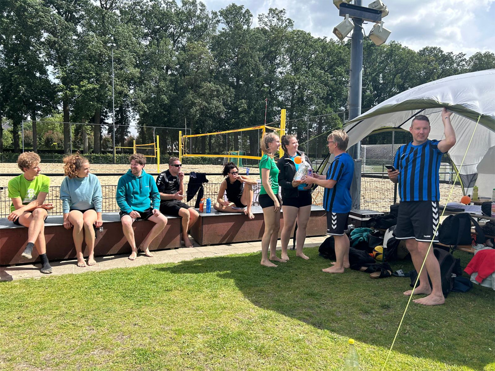 Aan de kust was er code geel waardoor beachvolleybaltoernooien daar werden afgelast. Meer landinwaarts bij ons was het prima beachweer. Even regende het hard, waardoor we met alle teams knus konden schuilen onder de partytent. Daarvoor en daarna liet de zon zich zelfs af en toe zien. Op het laatst begon de wind iets op te spelen. Die werd pas echt (te) hard toen de wedstrijden al waren gespeeld, want bij de prijsuitreiking vloog die partytent de lucht in.