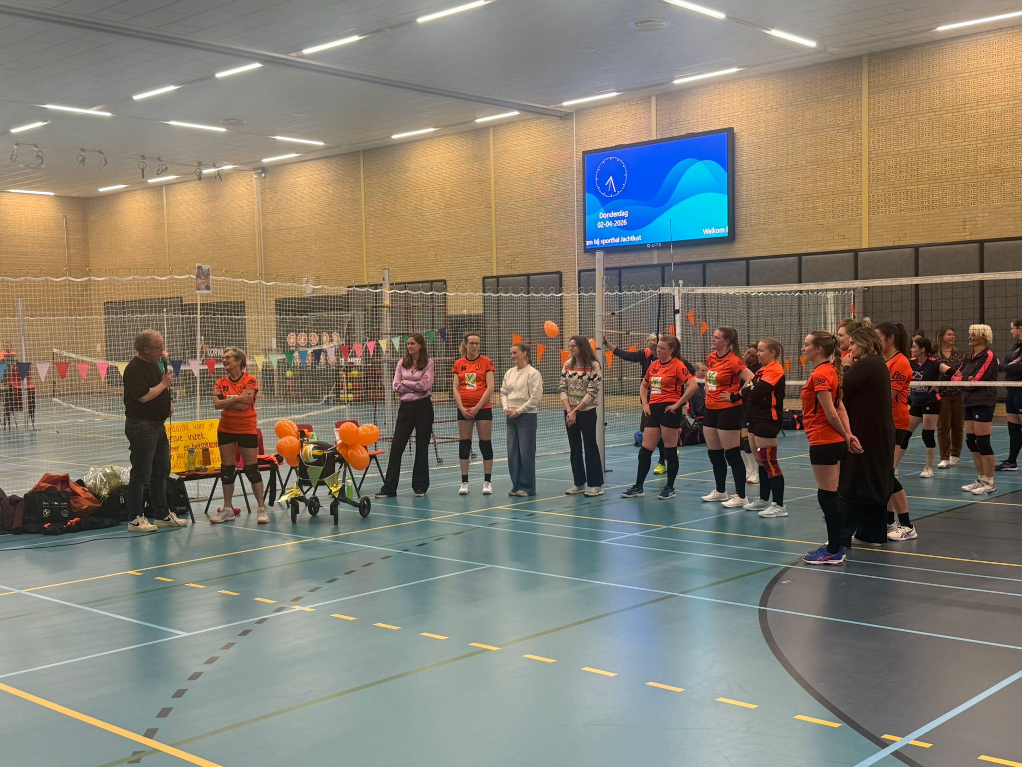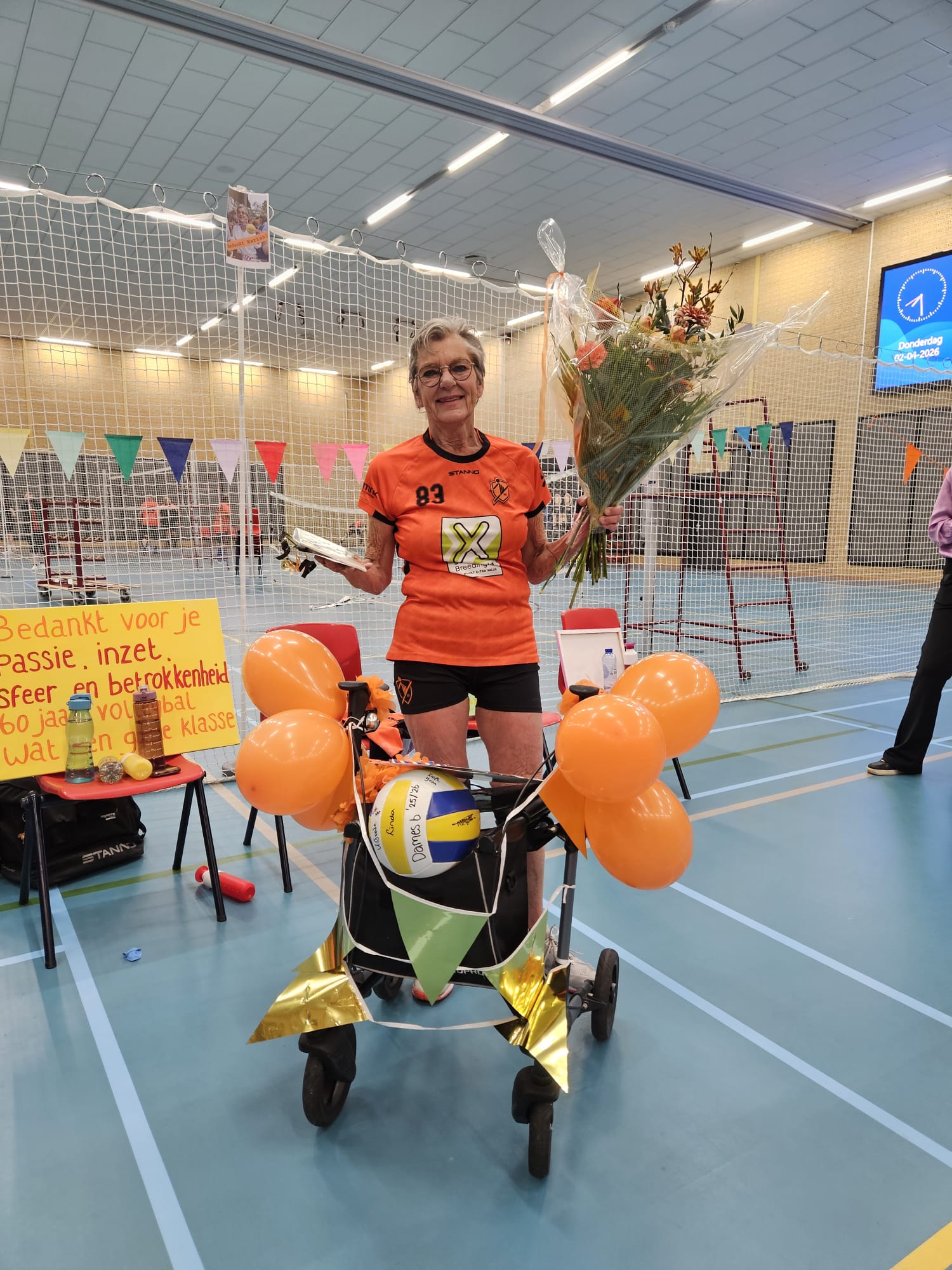 Het was een bijzondere avond afgelopen donderdag. Oud teamgenoten, oud trainers en kinderen en kleinkinderen kwamen naar sporthal Jachtlust om Marian Bevers nog 1 keer te zien spelen. Ruim 60 jaar speelde ze volleybal. Op haar 73e gaat ze met volleybal pensioen. Ze deed dat met een 3-2 overwinning op GTH Torpedo.